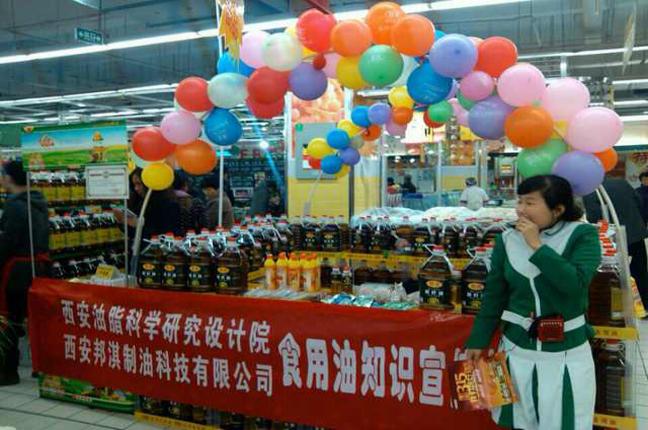 这次推广,油脂产业以邦淇获“2013陕西顾客满意度测评食用油行业最佳顾客满意奖”殊荣为契机,高度重视、精心组织、全员参与,以“您的健康、我的牵挂”为主题,贯穿“诚信、责任、担当”;体现“绿色、安全、科普”,为更好指导科学消费,特意邀请石羊油脂产业战略合作伙伴——西安油脂科学研究设计院有关专家全程参与西安的全部活动,接受消费者现场咨询、举办油品知识讲座、指导食用油鉴别常识,重点是结合石羊油品安全、绿色、健康的价值理念进行宣讲,西安KA分别在华润渭滨路店、人人乐玉祥门店举行,两天达成销量180桶;社区分别在大明宫西铁小区、凤城六路菁华名门、乾唐华府举行,两天实现销售100余桶,通过空桶优惠、赠送防雾霾口罩等形式,对邦淇特别是石羊品牌的传播意义深远。