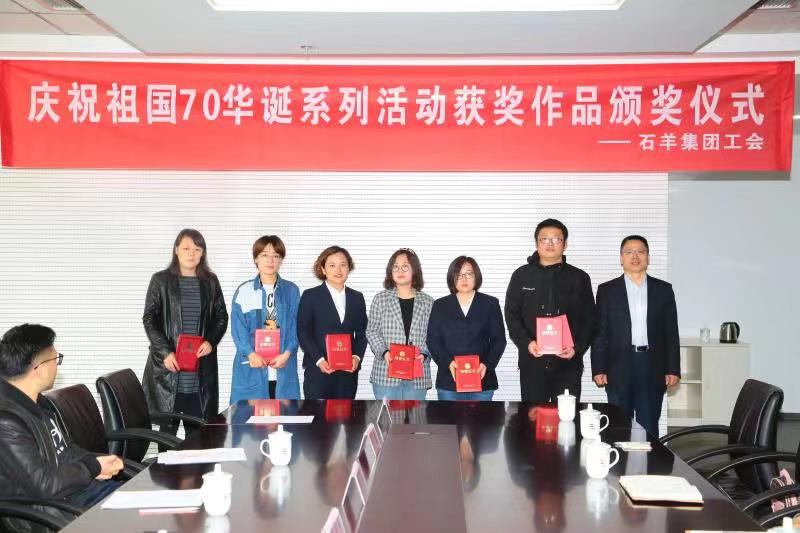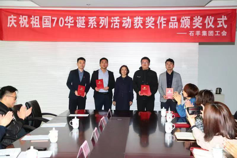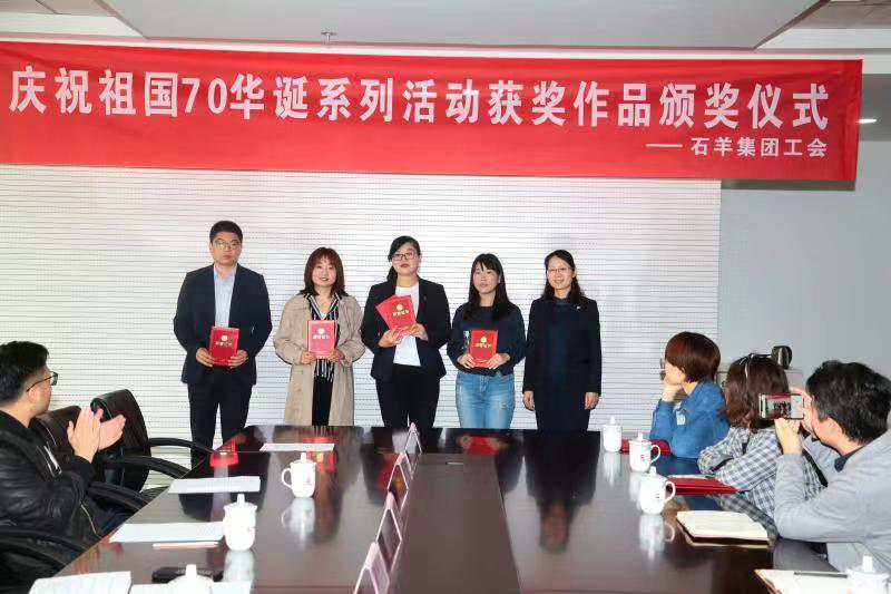 2019年10月12日上午,石羊集团工会组织的庆祝祖国70华诞“讴歌新时代·我与石羊共成长”系列活动颁奖典礼在集团总部四楼会议室举行,陕西省总工会经济部部长张朝惟,西安市经开区工会工委副主任盛钰,石羊集团工会主席段鹏博,副主席傅巧艳,经费审查委员会主任杨新虎,获奖员工及代表出席了颁奖典礼。