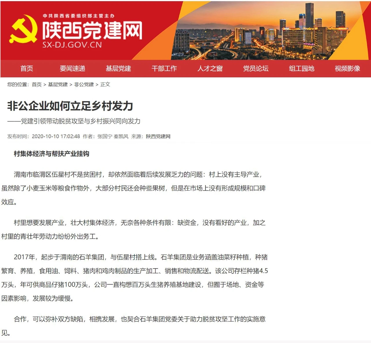 10月11日,陕西党建网刊登题为《非公企业如何立足乡村发力——党建引领带动脱贫攻坚与乡村振兴同向发力》报道。