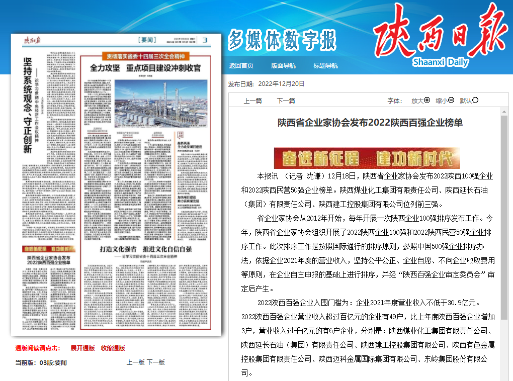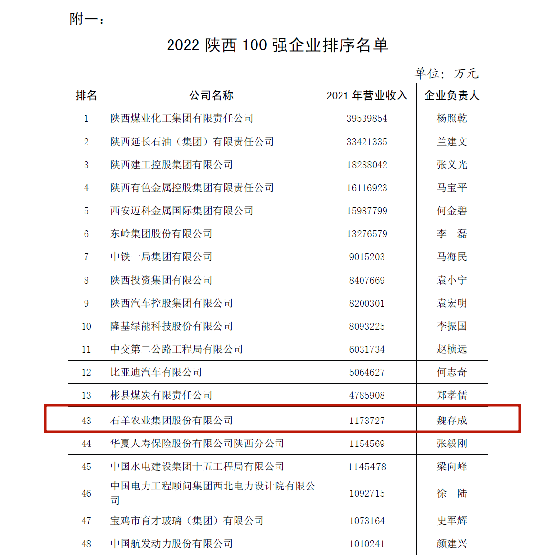 12月18日,由陕西省企业家协会牵头开展的2022年度陕西百强企业排序工作已经顺利完成,并官方公布。石羊集团以年收入117亿元荣登“2022陕西100强企业”榜单第43位,较去年上升2位。
