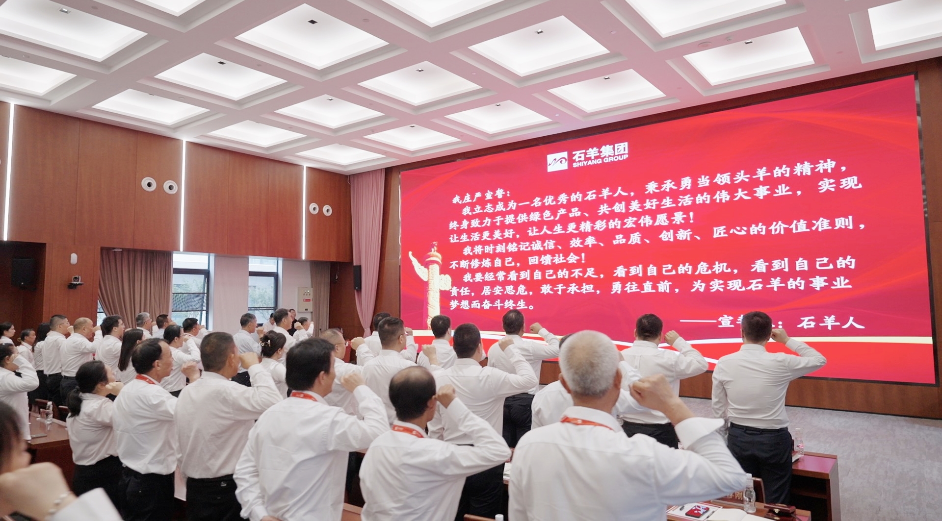 随后,集团副总裁刘恒带领全体参会人员齐声宣读《企业宣言》。“我立志成为一名优秀的石羊人,秉承勇当领头羊的精神……”,宣言掷地有声,进一步凝聚起全体员工为实现石羊宏伟事业梦想而奋斗的磅礴力量。