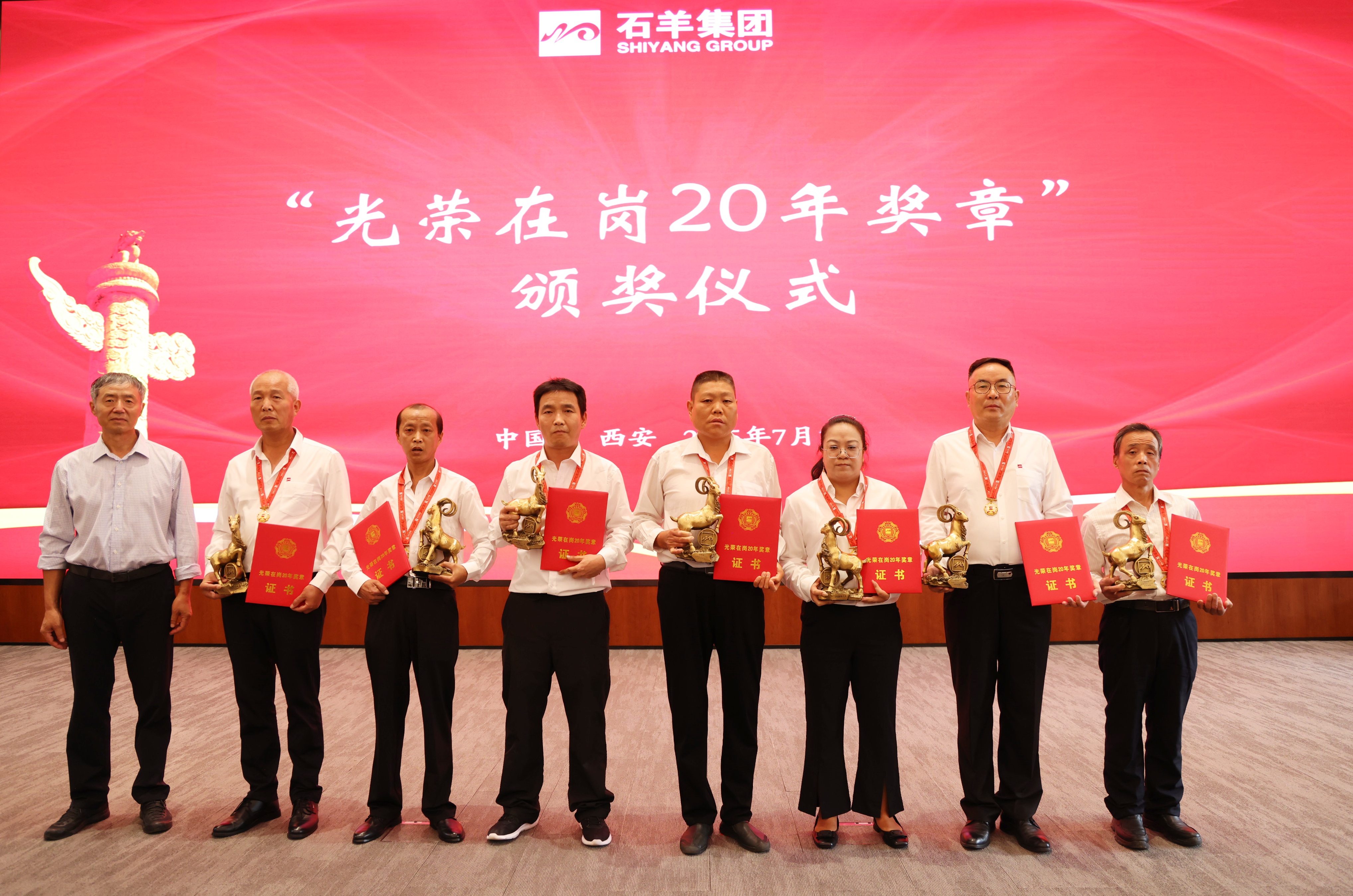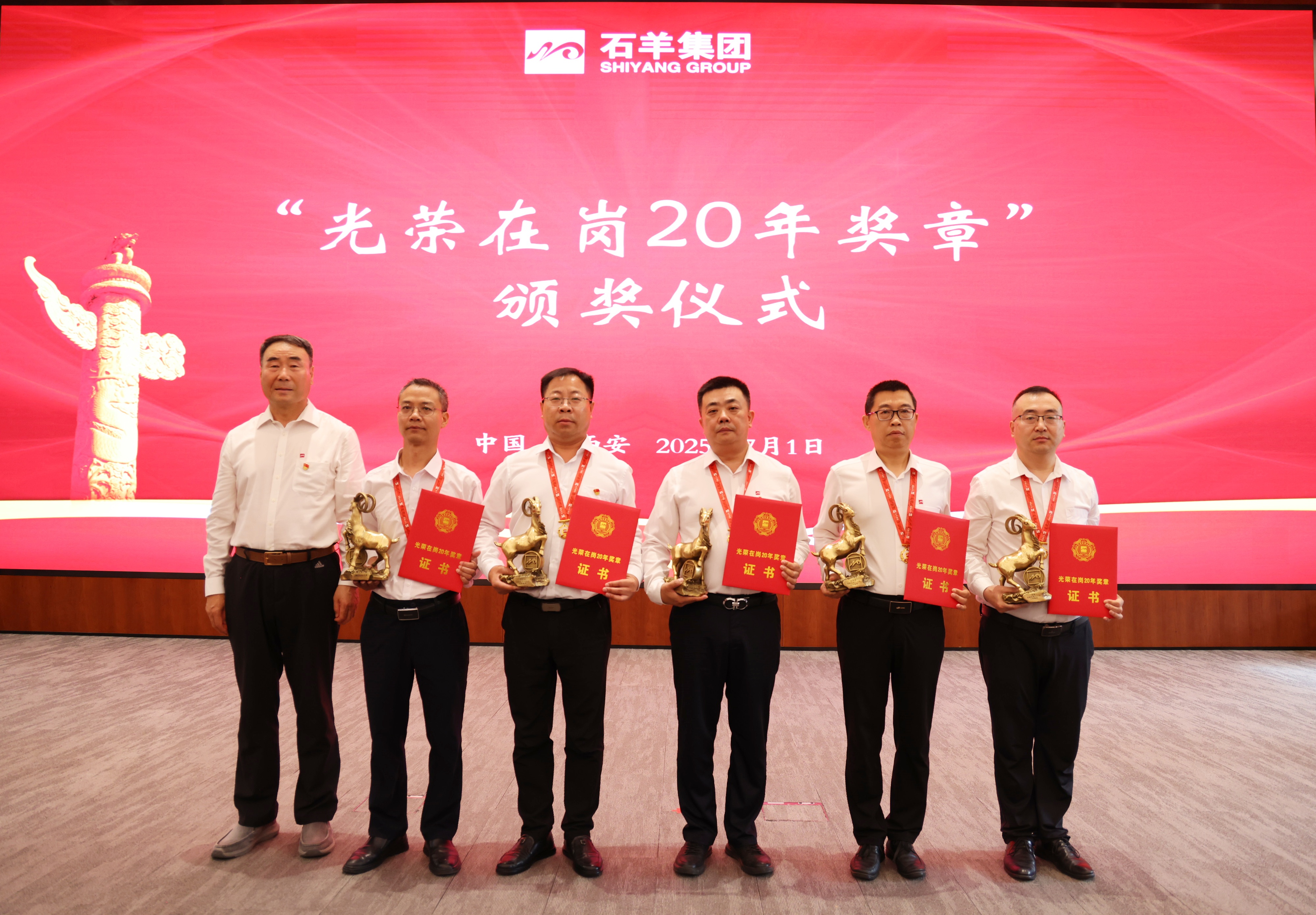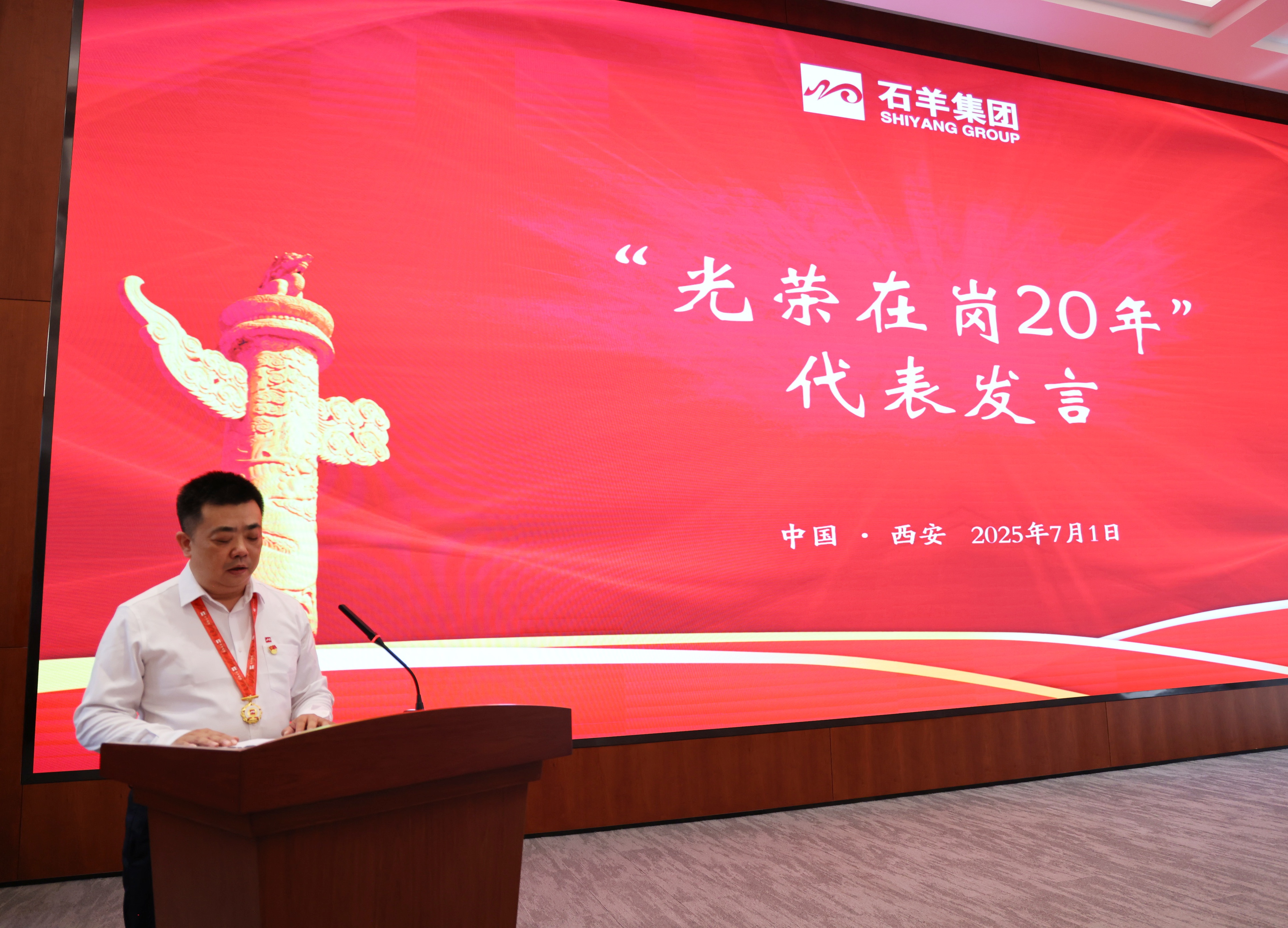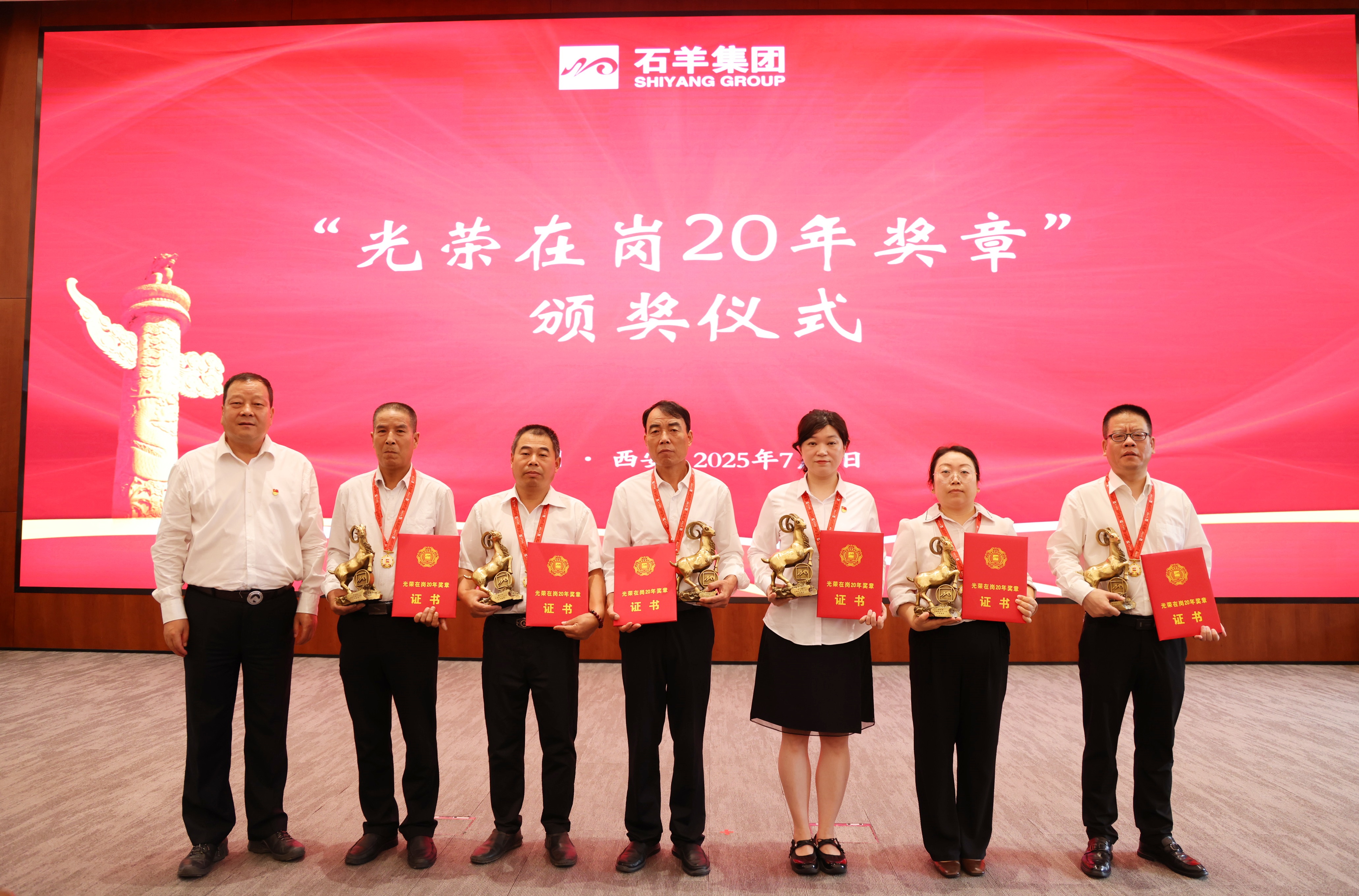 接下来,对在岗二十年员工进行表彰,颁发“光荣在岗20年奖章”。20年相伴相随,石羊人将青春与热血融入企业发展历程,在各自岗位上默默耕耘、无私奉献。当沉甸甸的奖章挂在胸前,闪耀的不仅是荣誉的光芒,更是他们20年如一日坚守与付出的见证,赢得了全场热烈的掌声与由衷的敬意。